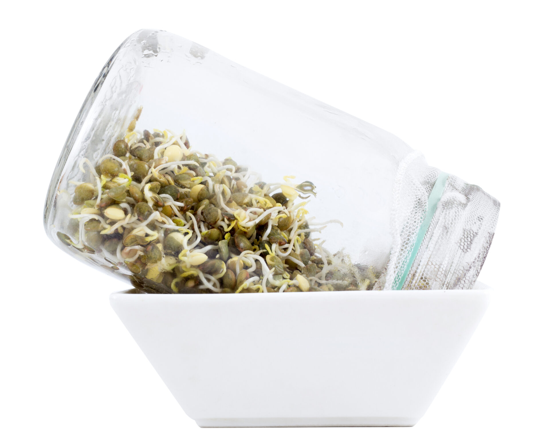 - Otwór słoika zakrywamy gazą i zabezpieczamy gumką recepturką, aby nasiona nie wypadły w czasie płukania