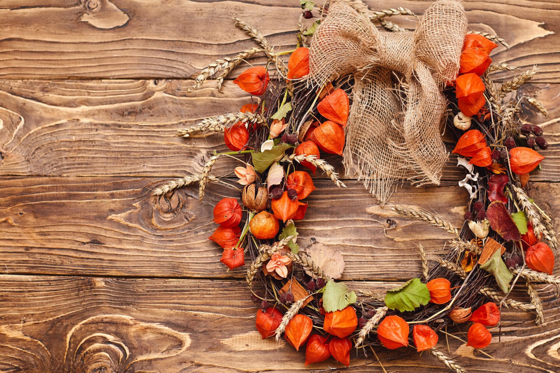 - Wianek świąteczny z pędów brzozy i miechunki z dodatkiem kłosów zbóż.