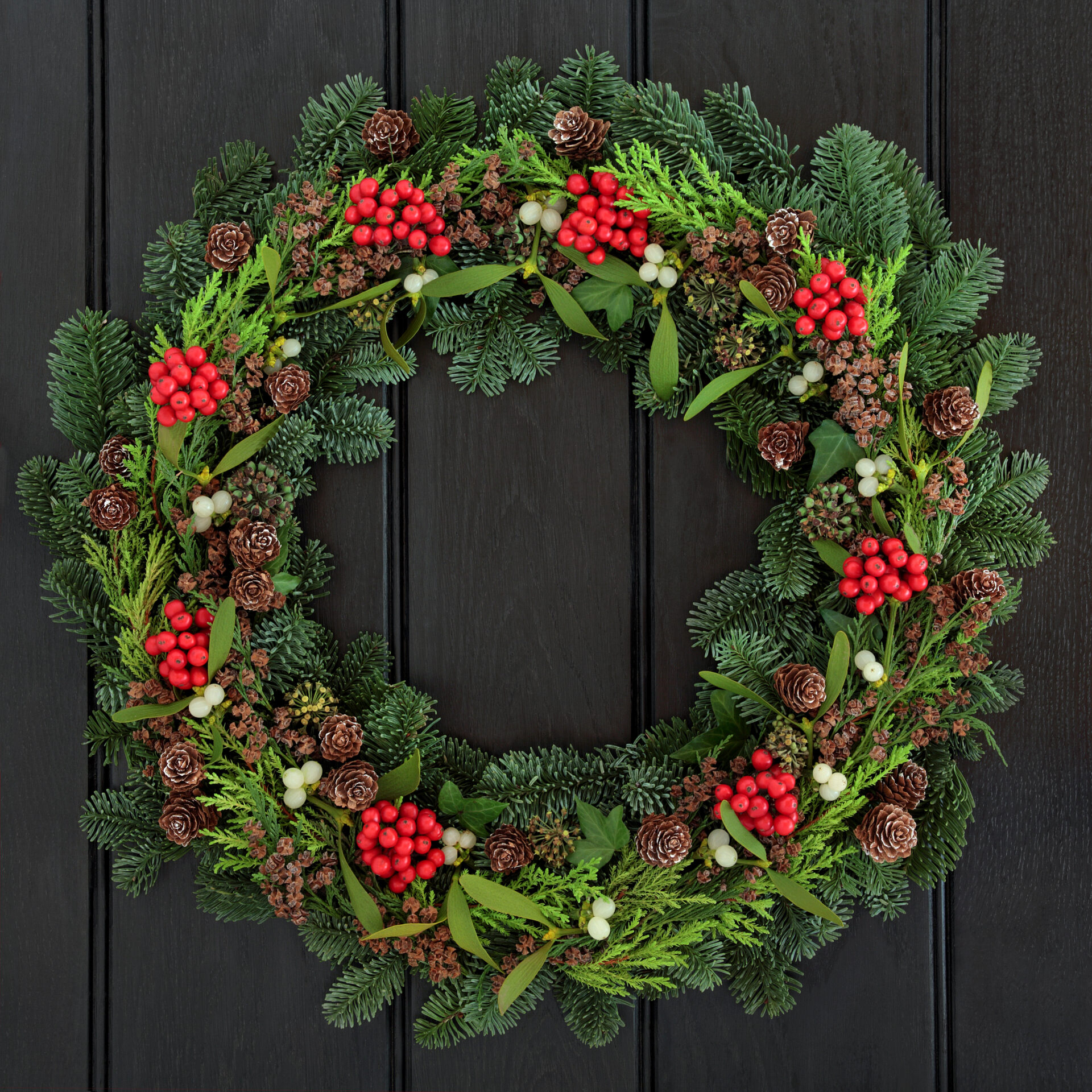 - Wieniec z pędami jodeł, cyprysików, ostrokrzewów, jemioły, i szyszkami sosen.